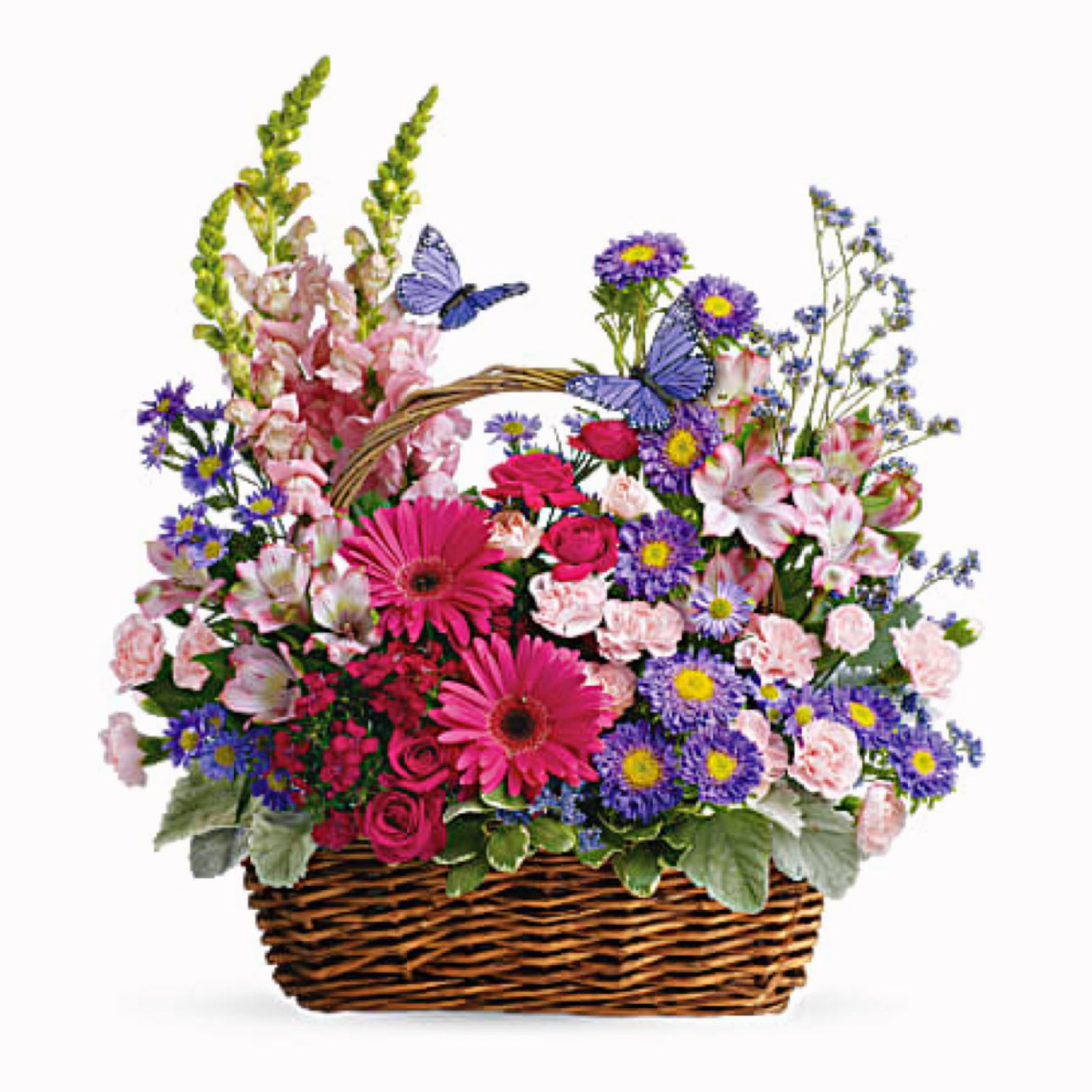This charming basket overflows with fresh pink and purple flowers—featuring alstroemeria, snapdragons, mini carnations, and seasonal asters—topped with whimsical butterflies for a playful touch. Arranged in a rustic woven basket, it’s a delightful gift for birthdays, get well wishes, or just because.
