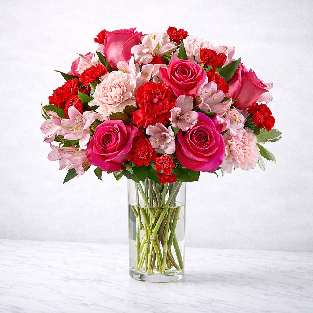 Soft blush pink blooms and vibrant roses come together in this elegant floral arrangement designed to brighten anyone’s day. Featuring beautiful roses and carnations accented with fresh greenery, this bouquet creates a romantic and graceful look that makes a lasting impression.